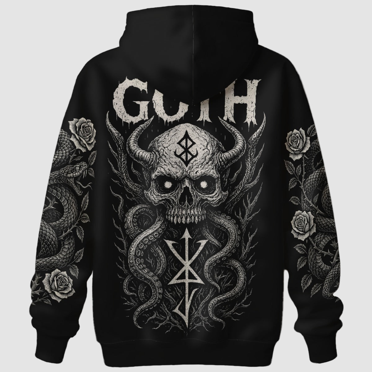 Vyjádřete svou individualitu díky jedinečné mikině „The Serpent’s Oath“ - vytvořené s ohledem na milovníky gotické estetiky a alternativní módy. Temný design s motivem lebky, hadů a růží symbolizuje sílu, tajemství a vnitřní klid. To není jen oblečení – to je manifest stylu.